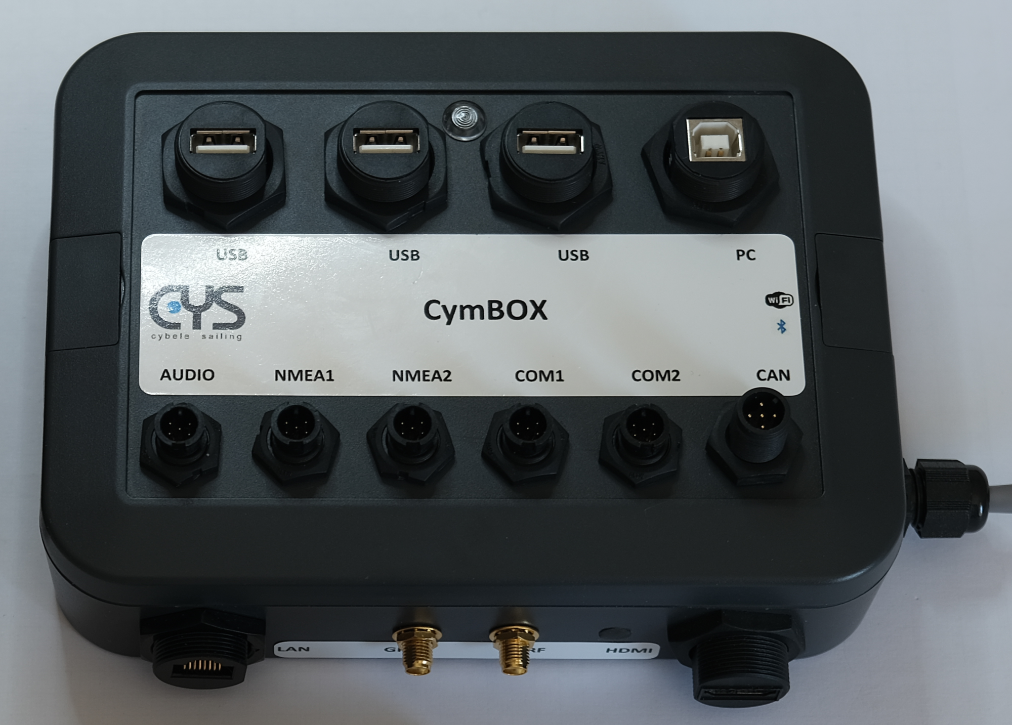 En façade du boîtier CysBOX, différents connecteurs étanches sont disponibles : COM1-2 (ports série haut débit), NMEA1-2 (NMEA0183), CAN (NMEA2000), Audio Analogique, 3 USB A pour périphériques externes (downstream), 1 USB B pour PC (upstream). Les connecteurs Amphénol LTW offrent des interconnexions inégalées pour les environnements difficiles.