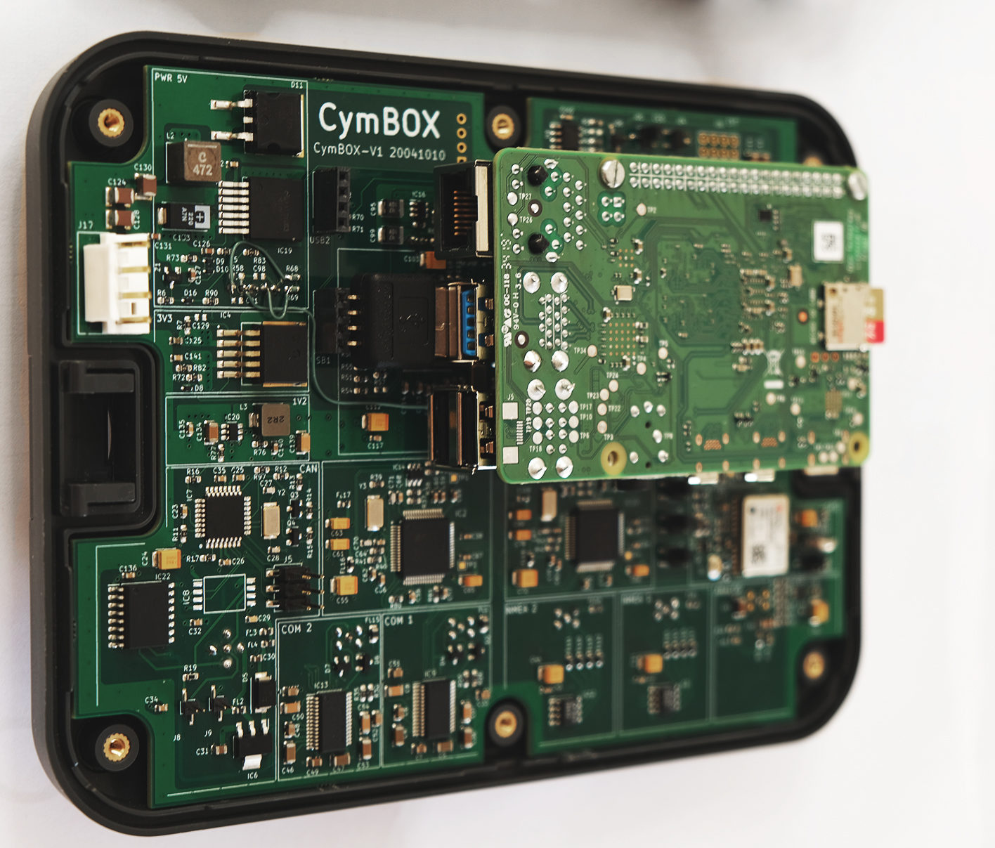 La vue interne montre que le câblage est réduit au minimum : câble d’alimentation, réseau et vidéo. La carte RaspBerry Pi4 se branche directement sur le connecteur GPIO et un connecteur USB-3 pour gérer les ressources offertes par le PCB principal CysBOX : périphériques internes (GPS, IMU, GW-NMEA2000, etc.) et interfaces externes (Hub USB, NMEA , COM, Audio, …)