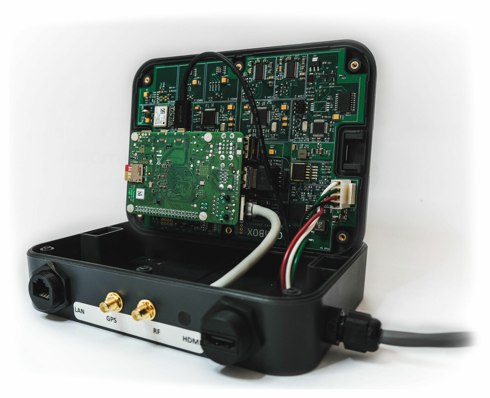 Sur le côté du boîtier CysBOX, des connecteurs réseau HDMI et RJ45 étanches permettent le raccordement à l’écran tactile étanche, et les connecteurs coaxiaux RF et GPS permettent le raccordement de télécommandes et d’antennes GPS.