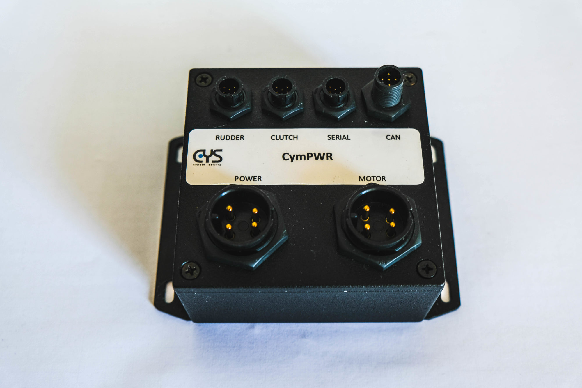 En façade du boîtier CysPWR, différents connecteurs étanches sont disponibles : SERIAL (ports série haut débit), CLUTCH (commande électro-vanne), RUDDER (capteur de barre), CAN (NMEA2000), et les connecteurs de puissance POWER (12V ou 24V) et MOTOR (servomoteur ou pompe hydraulique). Les connecteurs Amphénol LTW sont particulièrement adpatés aux environnements difficiles.