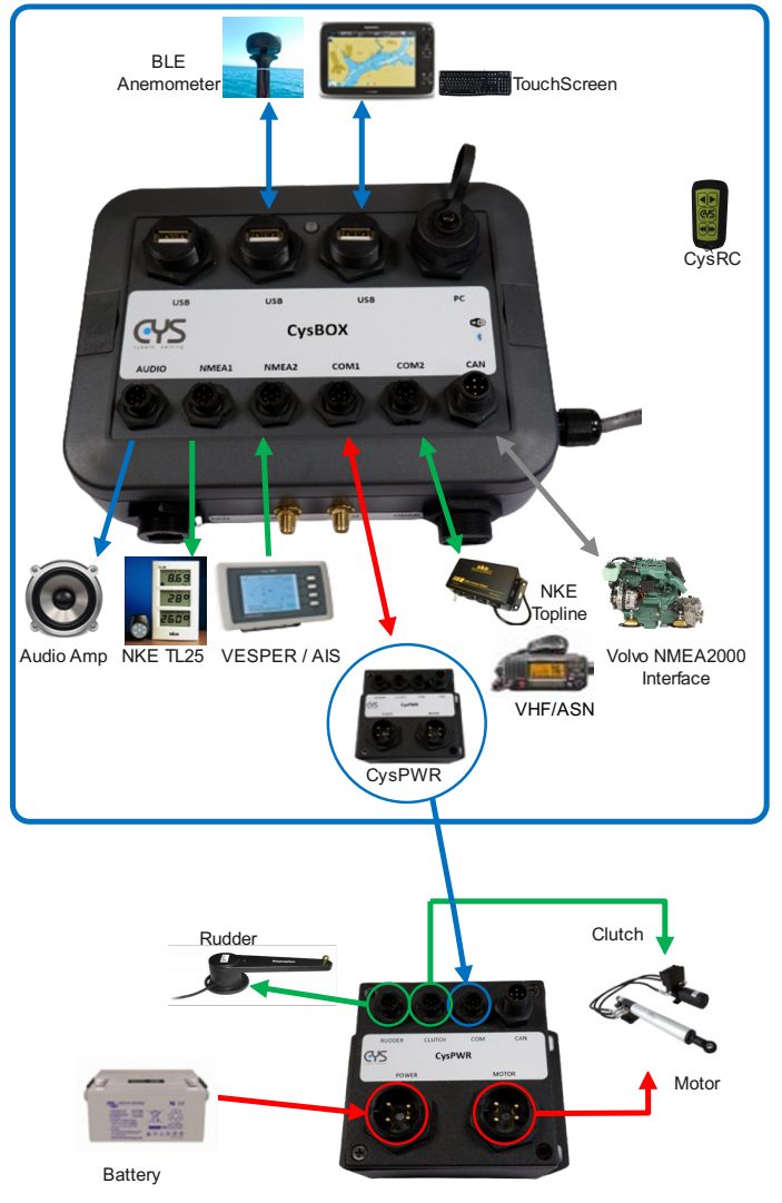 - CysBOX : unité centrale, « cœur » du système, qui offre des fonctionnalités avancées basée sur des logiciels open-source : logiciels existants (serveur signal-K, cartographie, …) ou développements propres (pilote, gestion d’alarmes, …)